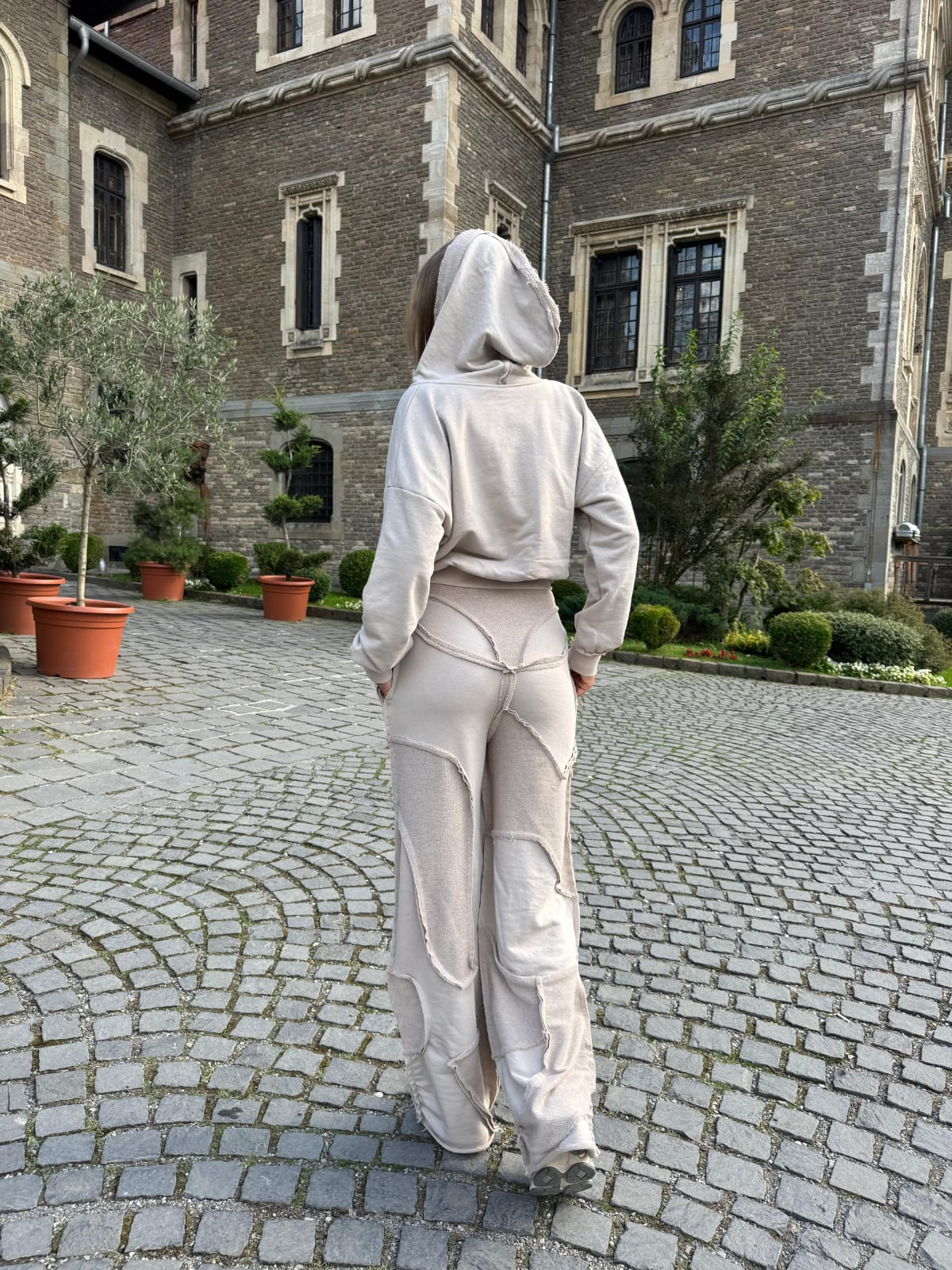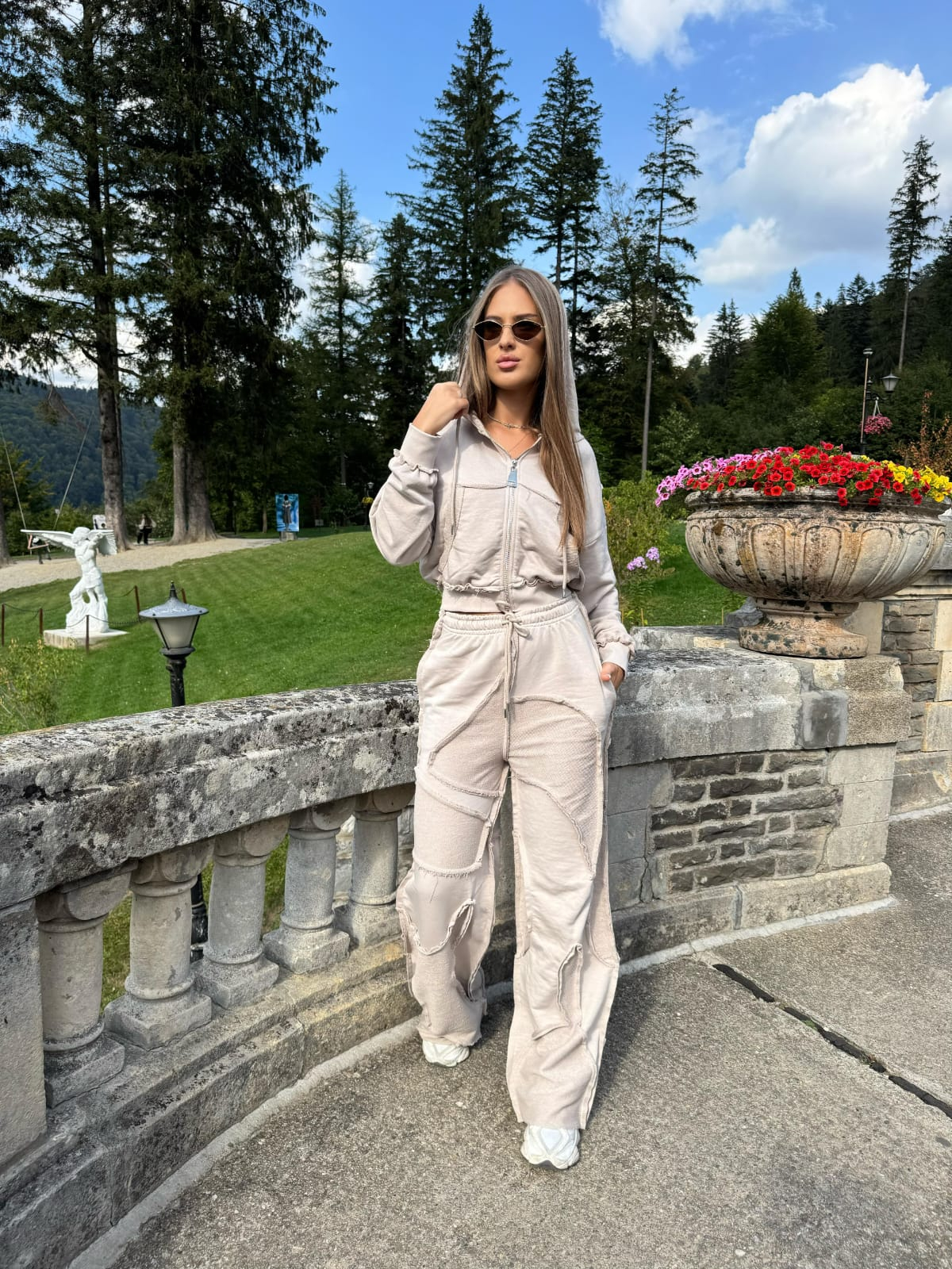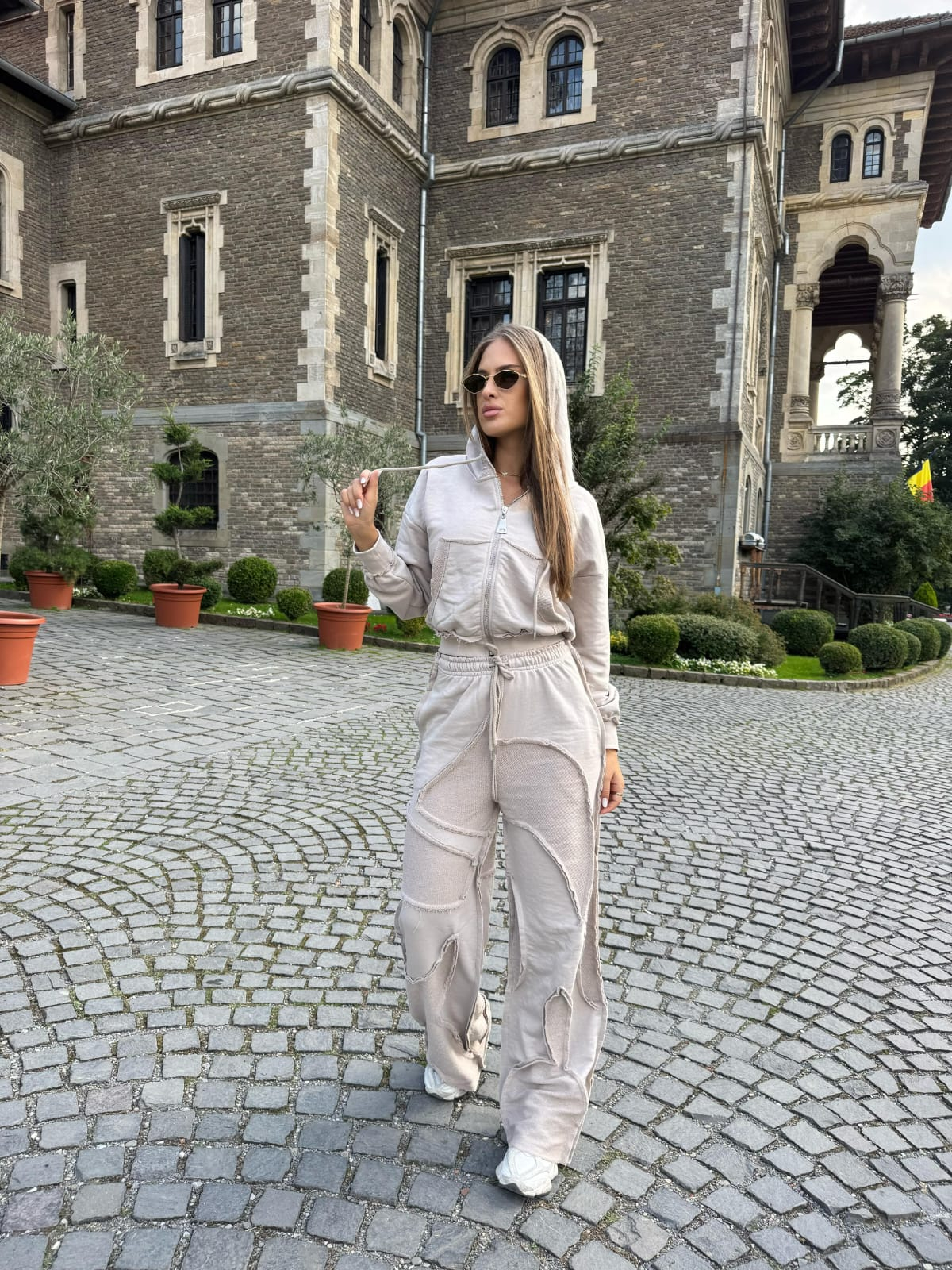 Compleu damă bej din două piese, realizat din 100% bumbac. Format din hanorac cu fermoar și pantaloni largi, are o croială lejeră care oferă confort și libertate de mișcare. Ideal pentru un look modern, casual și rafinat.