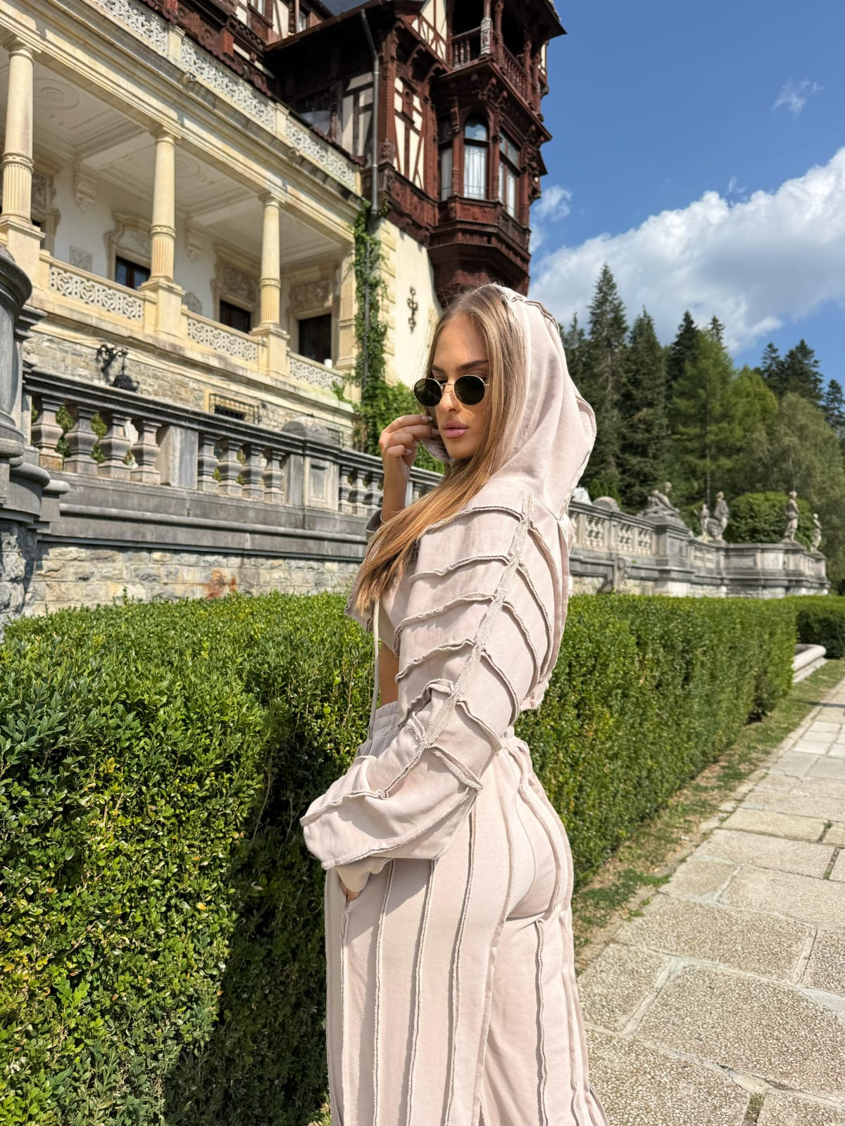 Realizat integral din 100% bumbac natural, setul oferă o senzație plăcută pe piele și menține căldura în zilele mai reci. Croiala amplă și textura verticală pun în valoare silueta, oferind un look elegant și relaxat în același timp.